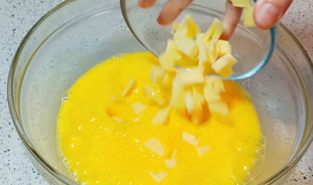 In einer Schüssel die Eier schlagen, den Emmentaler, das Salz und das Pesto hinzufügen.