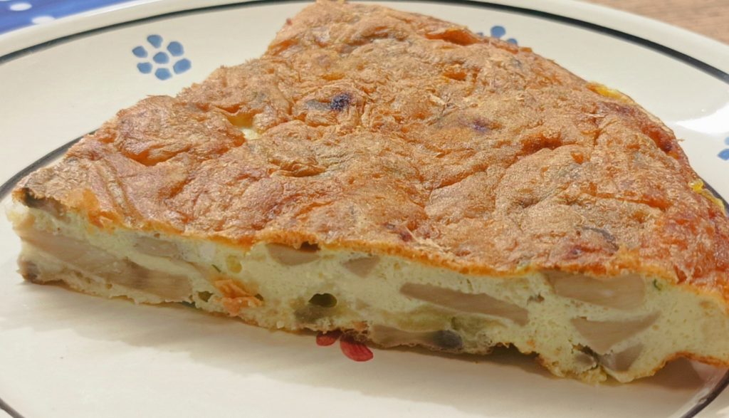 Nach etwa 15 Minuten ist das Omelett von der ersten Seite gegart, nun mit einem ausreichend großen Teller oder der Doppelpfanne das Omelett umdrehen und auf gleiche Weise die andere Seite für weitere 15 Minuten kochen lassen.