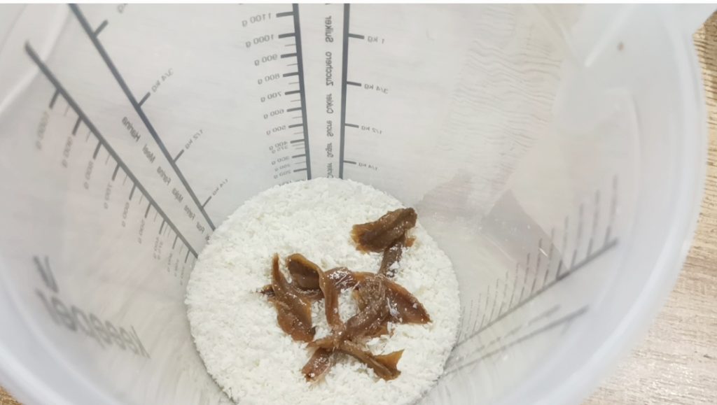 Währenddessen den Ricotta reiben, in einen Behälter geben und die Sardellen sowie eine halbe Schöpfkelle Kochwasser hinzufügen, alles mixen, um eine Creme zu erstellen.