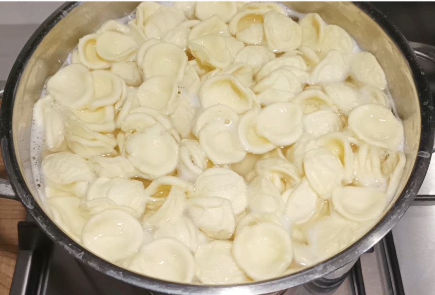 In einem Topf bringt etwas Wasser mit Salz zum Kochen, um die Orecchiette zu garen.