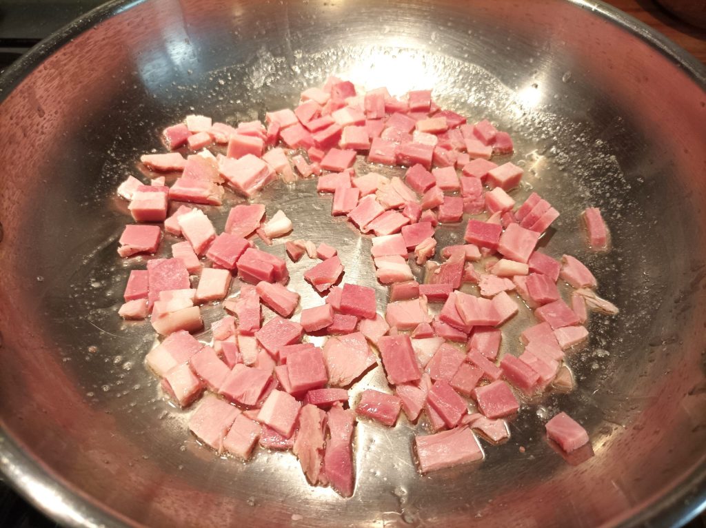 Bereiten Sie die Sauce vor, indem Sie ein wenig Öl in die Pfanne geben, erhitzen und dann die gewürfelten Schinken hinzufügen. Lassen Sie es 2 Minuten anrösten, dann die Sahne dazugeben, alles verrühren und 1 Minute weiterköcheln lassen. Schalten Sie es aus und kochen Sie in der Zwischenzeit die Pasta, indem Sie Salz ins Wasser geben.