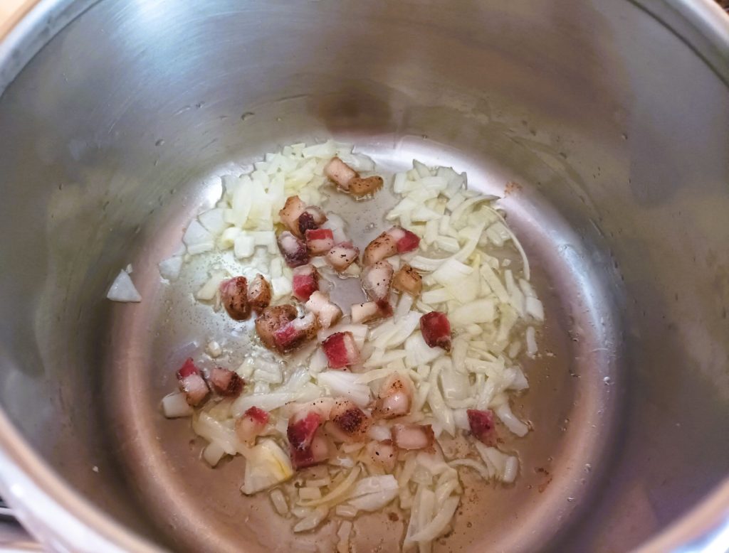 In einem Topf Öl, Zwiebel und Speck geben, einige Minuten anbraten.