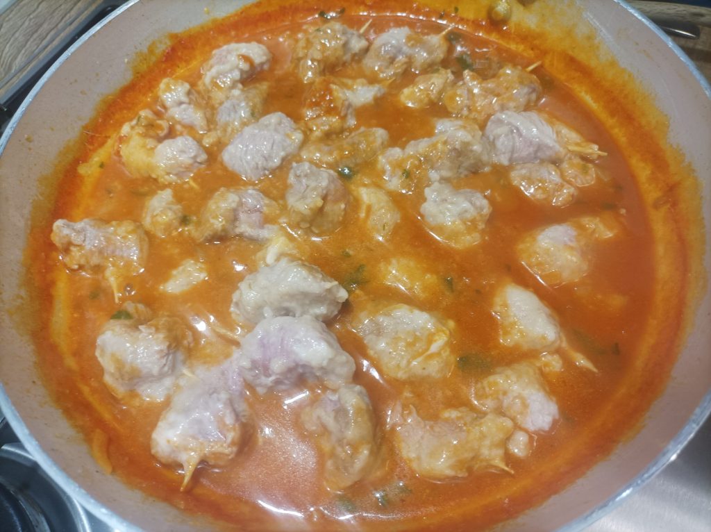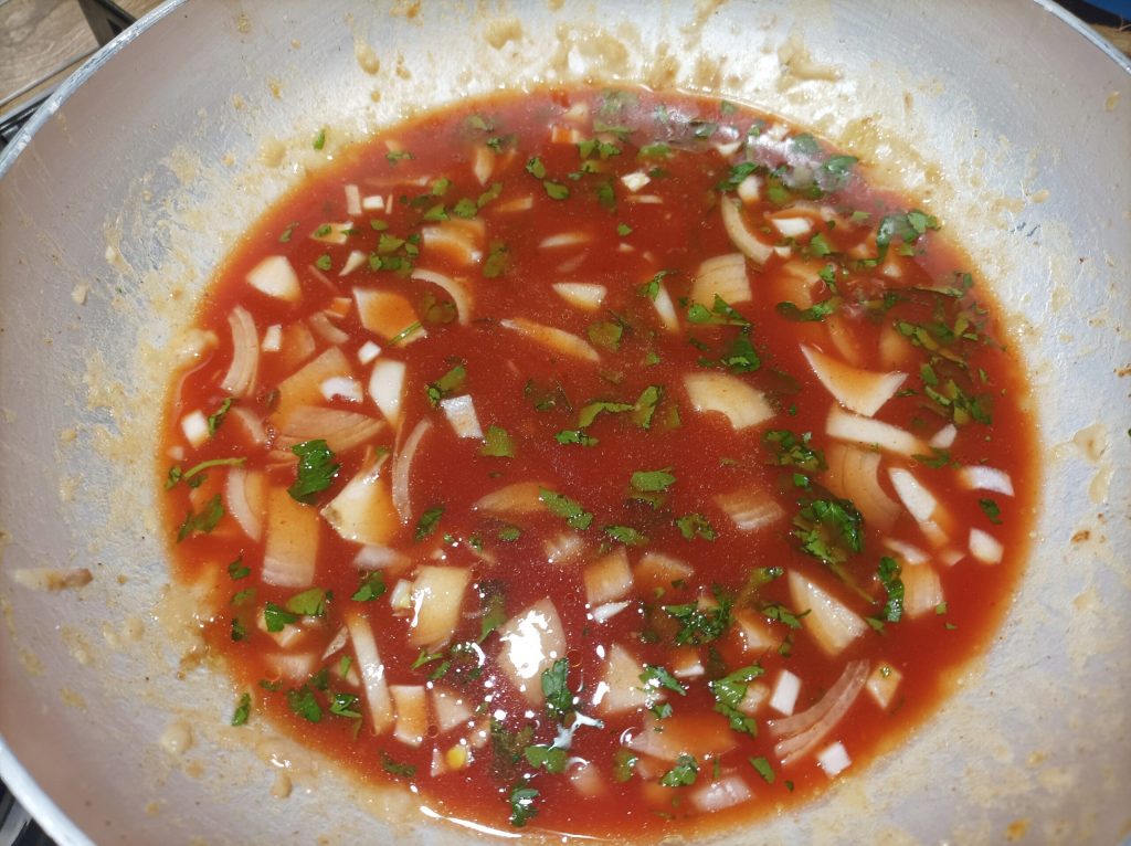 Die Brühe in denselben Topf gießen, in dem die Schnitzel waren, und Zwiebel, Petersilie, Peperoncino und Curry hinzufügen. 5 Minuten bei mittlerer Hitze kochen.