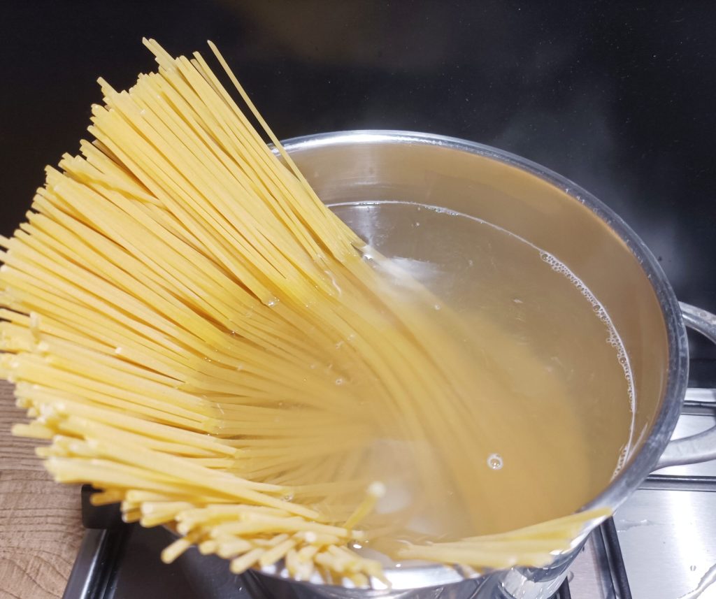 Schlagen Sie die Zutaten gut zusammen und fügen Sie eine Kelle Kochwasser der Spaghetti hinzu. Um die Eier zu pasteurisieren, stellen Sie den Behälter mit der Creme auf einen kleinen Topf mit Wasser und bringen Sie die Eigelbe auf eine maximale Temperatur von 65 °C, um zu verhindern, dass sie gerinnen.