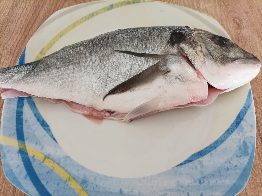 Zuerst den Wolfsbarsch säubern und filetieren. Das ist eine etwas anspruchsvolle Aufgabe, daher ist es besser, dies vom Fischhändler erledigen zu lassen, wie ich es gemacht habe, aber wenn ihr möchtet, könnt ihr es auch selbst versuchen.