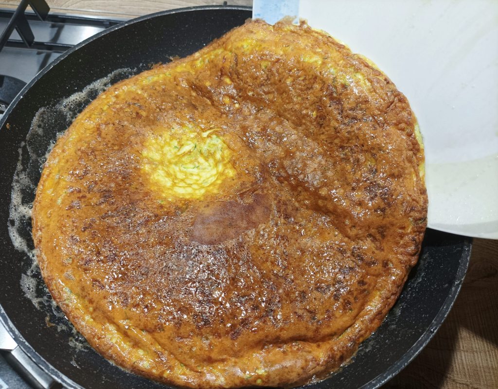 Sie werden sehen, dass das Omelett ein wenig aufbläht. An diesem Punkt, wenn es oben nicht mehr flüssig ist, drehen Sie es mit einem Teller oder Deckel um. Lassen Sie die andere Seite weitere 10 Minuten kochen.