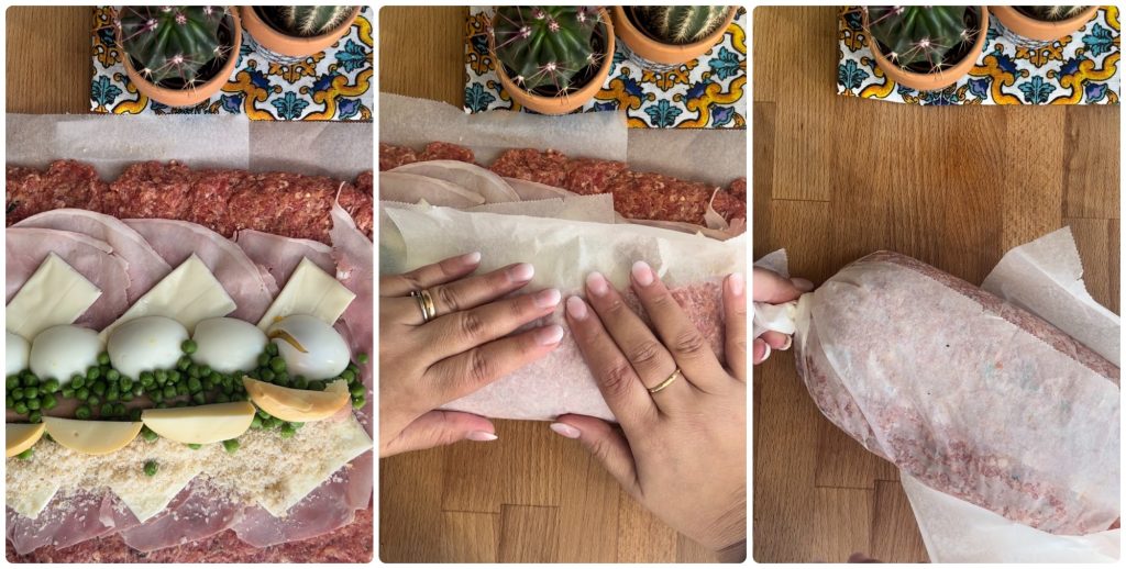 Nun nach Belieben mit verschiedenen Wurstsorten, Käse und etwas Gemüse füllen. Ich habe gekochten Schinken, Provola, Würstchen, hartgekochte Eier, Erbsen und Scamorza verwendet. Aber man kann Spinat für die grüne Farbe oder eine Karotte verwenden, verschiedene Käsesorten und auch Speck oder Schinken statt des Schinkens nutzen. Meine Großmutter legte oft statt der Würstchen auch eine Wurst oder Salami-Paste hinein.
