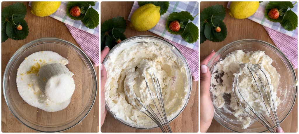 Fügen Sie anschließend den Zucker und die abgeriebene Schale einer halben Zitrone hinzu, rühren Sie schnell mit einem Schneebesen um, wenn Sie möchten, dass die Creme glatter und seidiger wird, können Sie die Ricotta-Creme durch ein Sieb passieren.