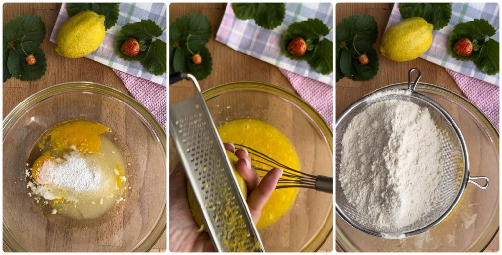 Widmen Sie sich nun der Herstellung des Mürbeteigs ohne Butter, mischen Sie in einer Schüssel schnell die Eier mit dem Öl, dem Backpulver, dem Zucker und der Schale einer halben Zitrone.