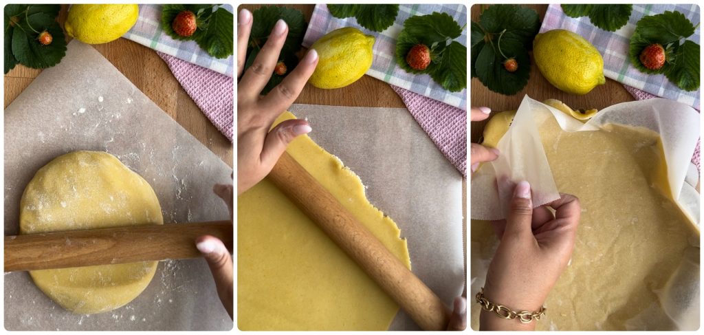 Rollen Sie den restlichen Mürbeteig auf einem Blatt Backpapier aus und formen Sie eine Scheibe von etwa einem halben cm Dicke.