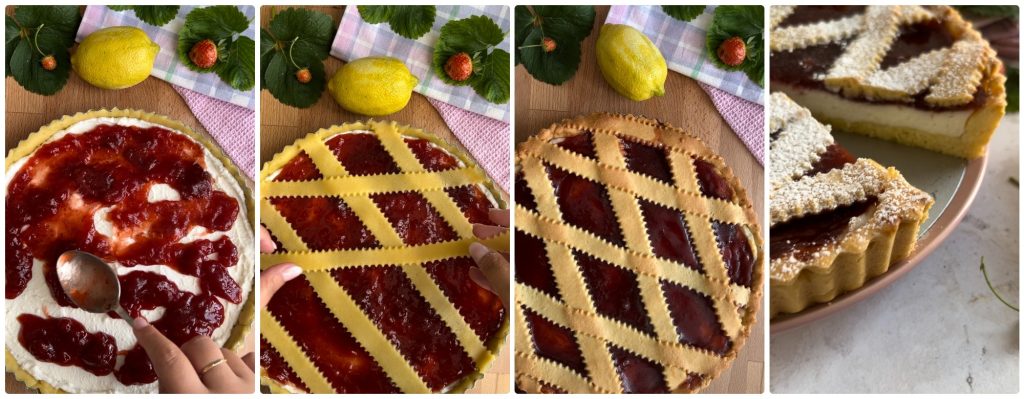 Nehmen Sie den beiseite gelegten Mürbeteig und schneiden Sie etwa 3 cm breite Streifen, entweder mit einem gewellten Teigrad oder einfach mit einem Pizzaschneider oder Messer, und gestalten Sie das klassische Dekor auf der Torte.