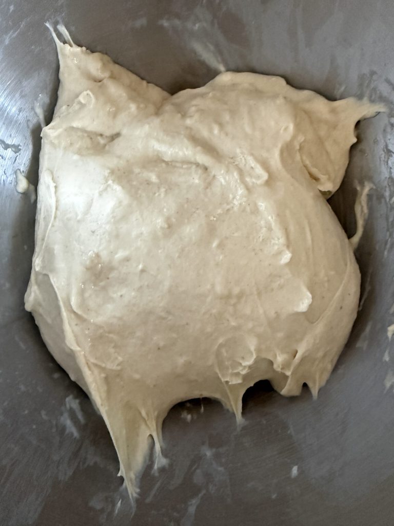 Weiterhin mit dem Flachrührer eingesetzt, das Wasser nach und nach zugeben, bis etwa 200 g erreicht sind: Der Teig wird zunächst grob aussehen, wie auf dem Foto. Jetzt den Flachrührer abnehmen, den Knethaken einsetzen und das restliche Wasser nach und nach zugeben, dabei 15 g für den nächsten Schritt zurückhalten.