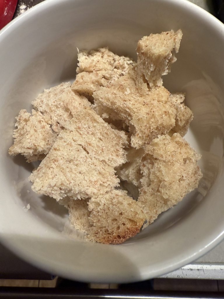 Füge die Milch hinzu und decke zu. Lass es mindestens eine halbe Stunde ruhen, besser eine Stunde: das alte Brot muss gut durchweichen, weich, aber nicht matschig werden. Solltest du hartes Brot verwenden, kannst du die Einweichzeit etwas verlängern.