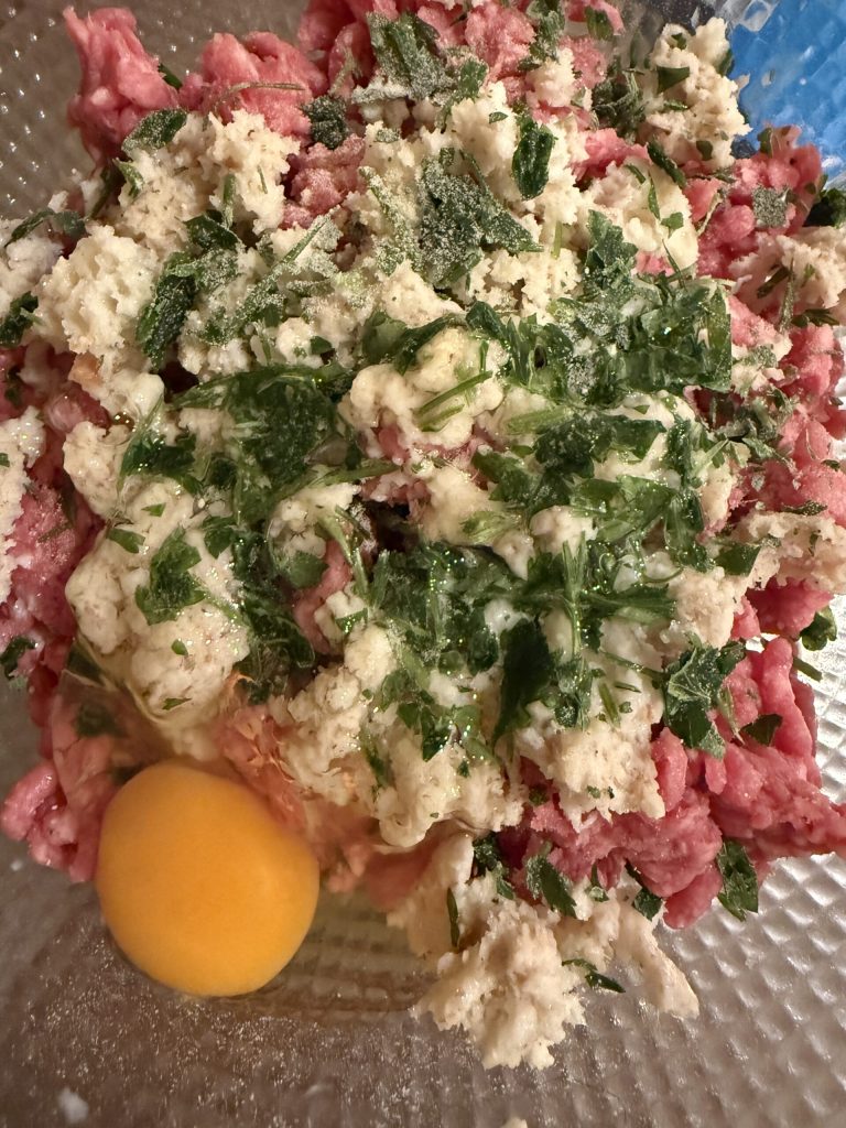 Füge ein großes Ei und etwas gehackte Petersilie hinzu, dann beginne mit den Händen, alle Zutaten zu vermengen. Es dauert etwa zehn Minuten.