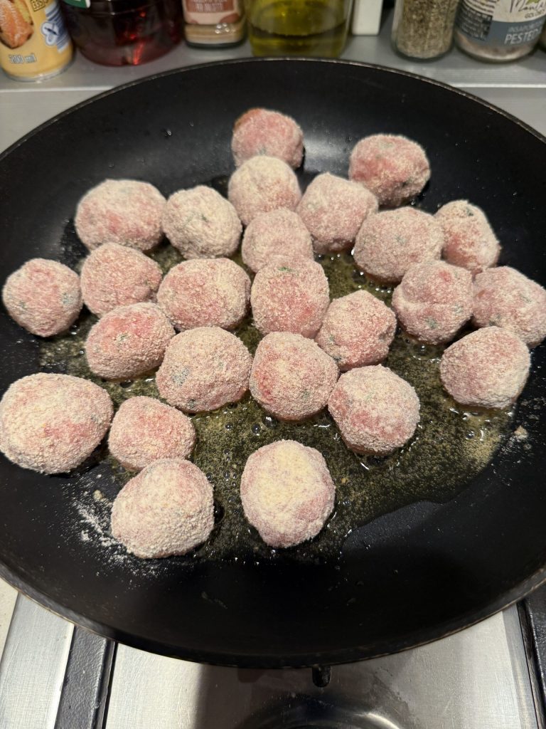 Brate und bräune die Klößchen gut an, damit sich eine schöne Kruste bildet, indem du sie häufig von allen Seiten wendest. Wenn sie gut gebräunt sind, füge die ausgepressten Kapern hinzu und lasse alles ein paar Minuten durchziehen.