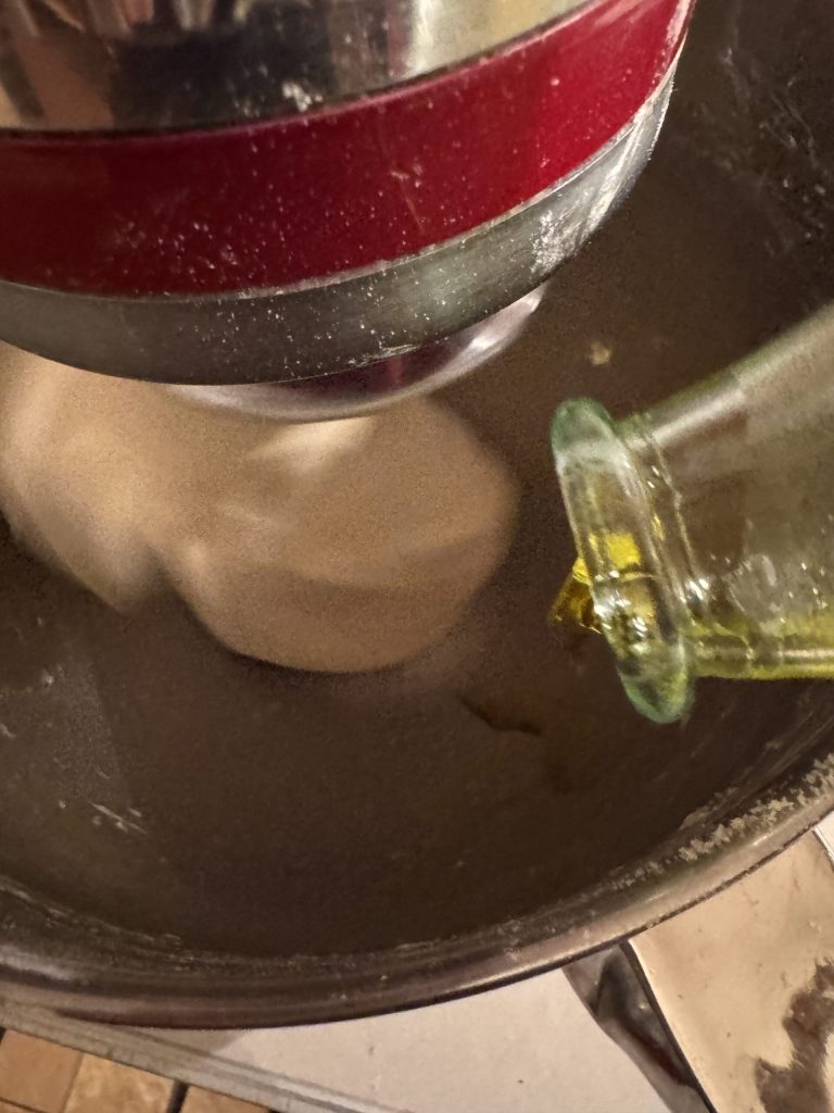 Wenn der Teig gut gebunden ist, das Öl nach und nach hinzufügen und die Geschwindigkeit erhöhen, um den Teig erneut zu binden. Den Teig mit dem Salz abschließen und erneut binden. Sobald die Schüssel sauber ist und der Teig am Haken hängt (ein Zeichen, dass die Bindung erfolgt ist), die Maschine ausschalten und den Teig in einen leicht geölten Behälter mit Deckel umfüllen. Nach einer halben Stunde Ruhezeit den Teig zweimal im Abstand von einer halben Stunde in der Schüssel falten. Eine weitere Stunde warten und dann den Teig über Nacht in den Kühlschrank stellen.