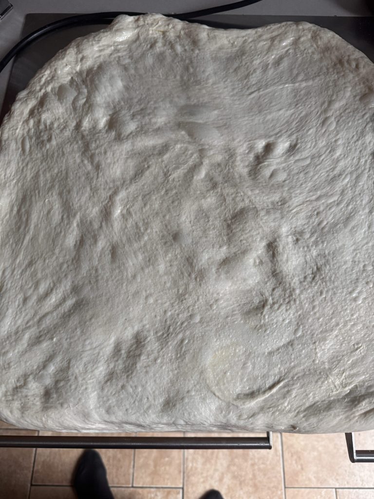 Über Nacht im Kühlschrank reift und geht der Teig etwas auf. Am nächsten Tag den Teig aus dem Kühlschrank nehmen und bei Raumtemperatur verdoppeln lassen.