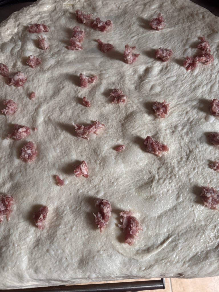 Wenn der Ofen gut heiß ist und die Salzlake leicht eingezogen ist, die restliche Wurst darüberstreuen.