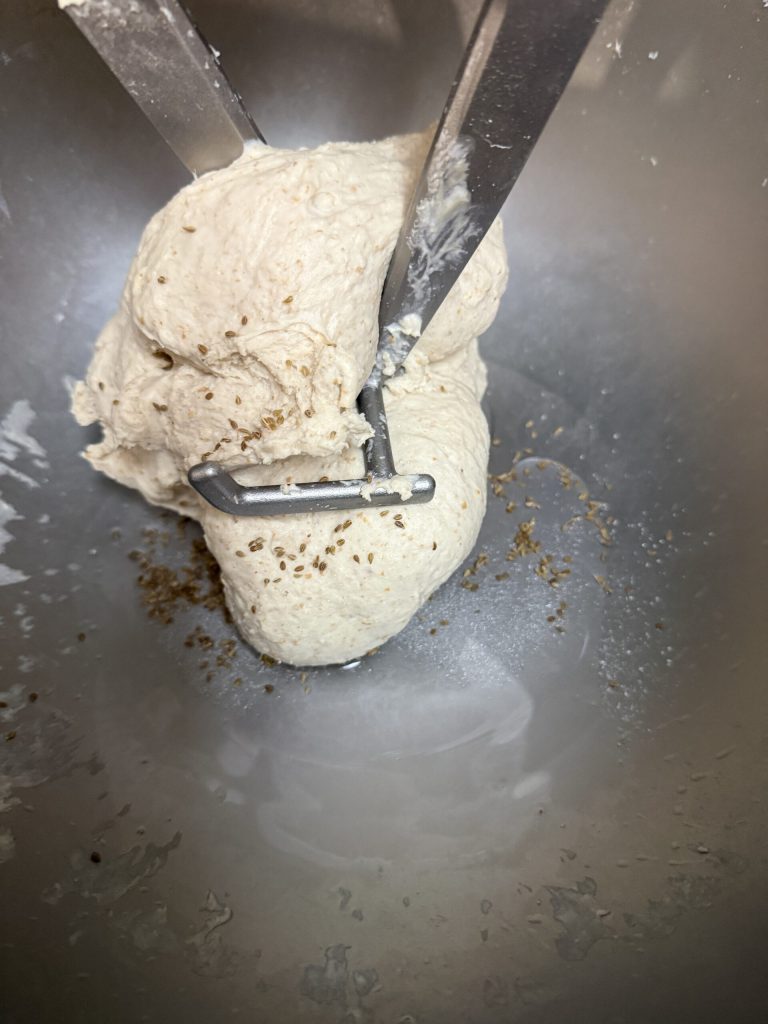 Beginne nun, die Mehle nach und nach einzusieben und wechsle sie mit dem restlichen Wasser ab. Sobald der Teig kompakt wird, setze den Knethaken ein und arbeite mit Stufe 2 oder 3. Gib jetzt die Tahin hinzu und schließlich die Anissamen und das Salz.