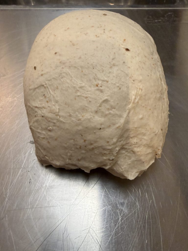 Erhöhe leicht die Geschwindigkeit und arbeite weiter, bis eine perfekte Hochziehspannung entsteht: der Teig sollte glatt, elastisch sein und sich vollständig von den Schüsselwänden lösen.Am Morgen nimmst du den Behälter aus dem Kühlschrank. Der Teig wird kalt und gut gereift sein, vielleicht sogar leicht aufgegangen.