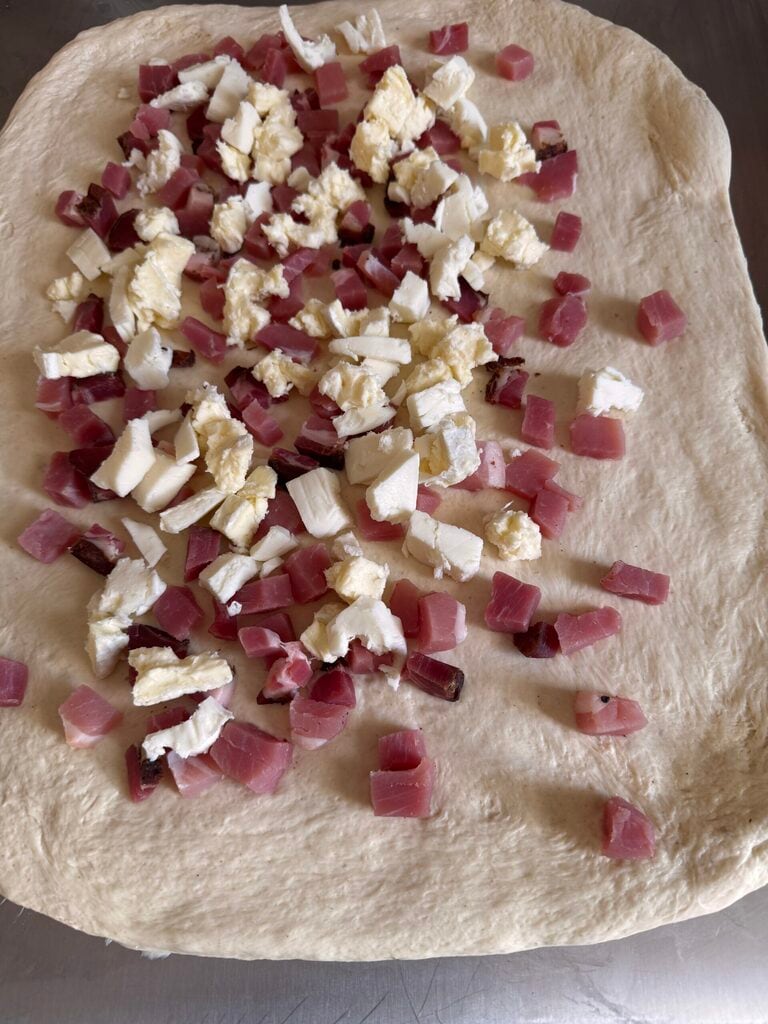 Beginnen, den Teig mit den Speckwürfeln zu füllen. Zwei Finger Platz rundherum lassen.