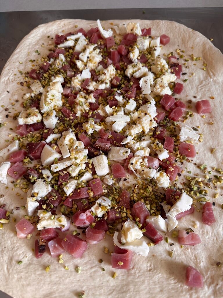 Mit dem Pistazien-Granulat bestreuen und backen.