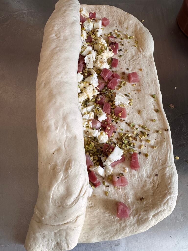 Den Teig aufrollen und darauf achten, dass die Füllung darin bleibt.