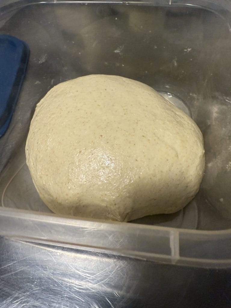 Einmal verknetet, machen Sie drei Falten mit der Slap-and-Fold-Methode auf dem Backbrett in Abständen von 15 Minuten und legen Sie es dann in einen geschlossenen Behälter. Über Nacht in den Kühlschrank stellen.