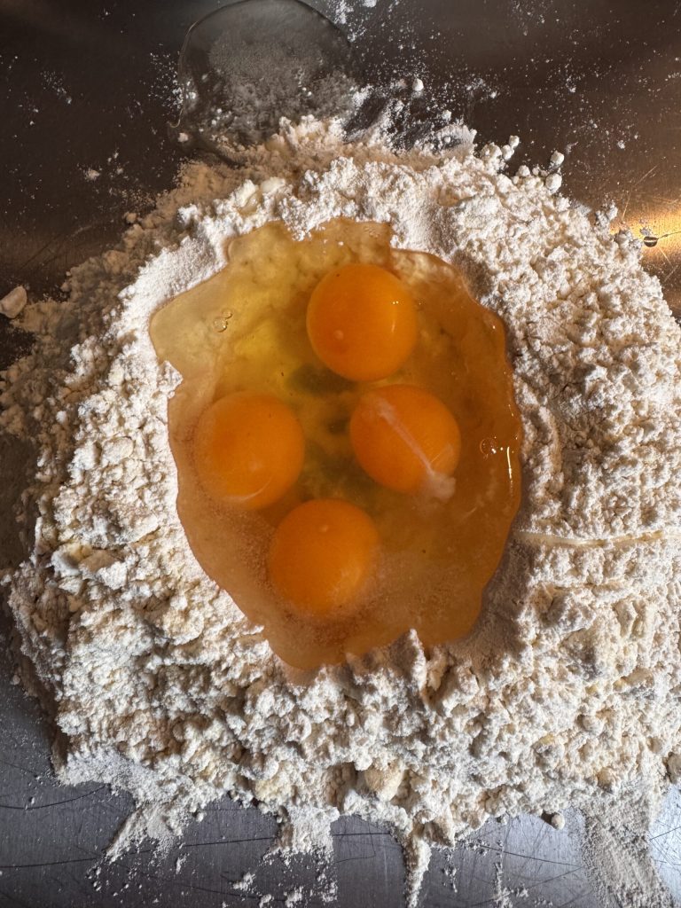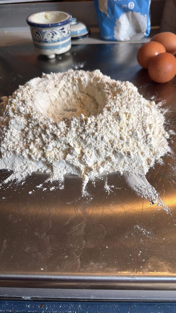 Die beiden Mehle mischen und auf die Arbeitsfläche geben. Eine traditionelle Kuhle formen.
