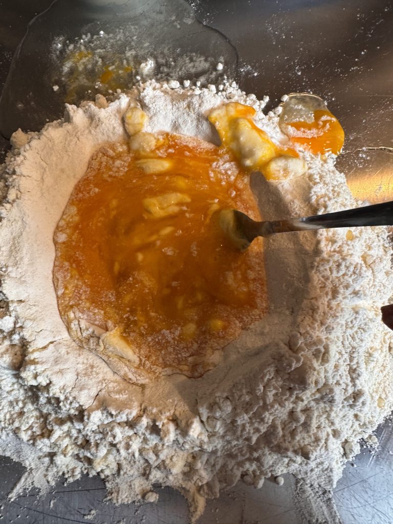 Mit einer Gabel die Eier verquirlen und anfangen, das Mehl einzuarbeiten. Man kann die Eier auch vorher verquirlen, bevor man sie in die Kuhle gibt.