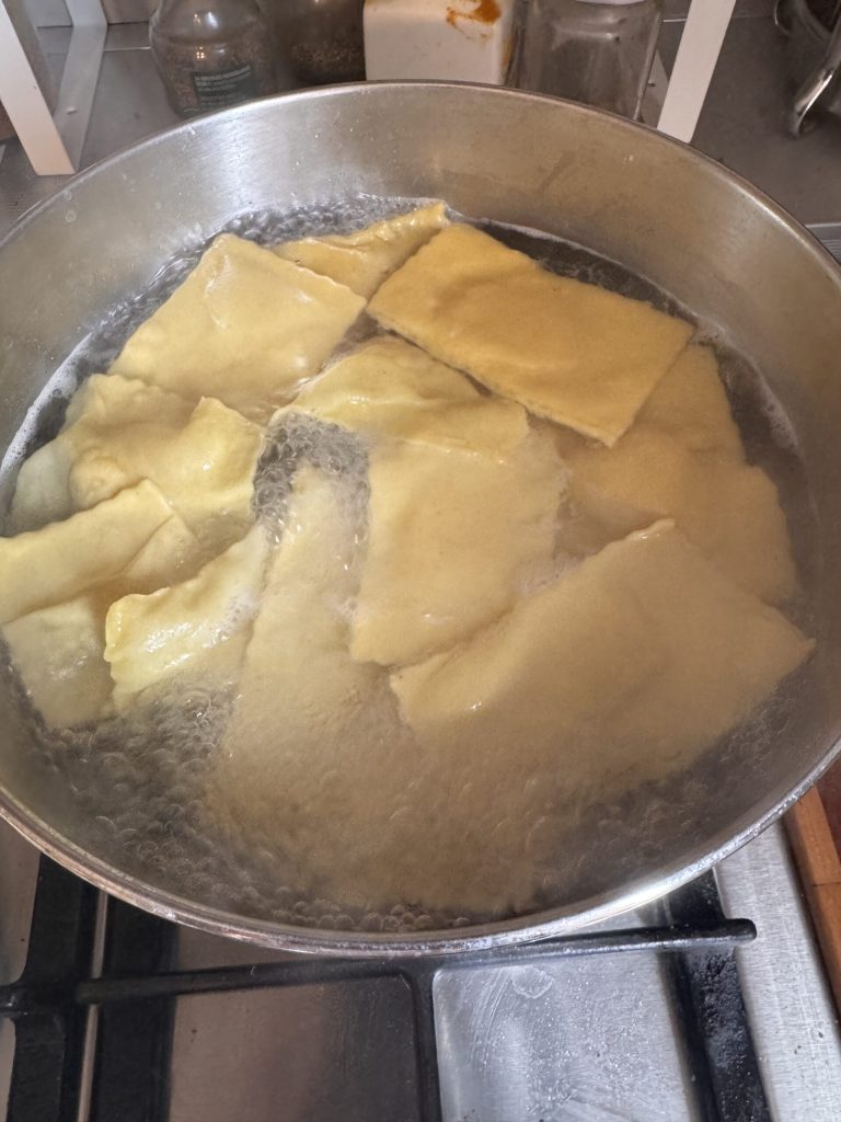 In einem sehr großen Topf reichlich Salzwasser zum Kochen bringen. 7/10 Tortelli auf einmal hineinwerfen und umrühren, damit sie nicht aneinander kleben.