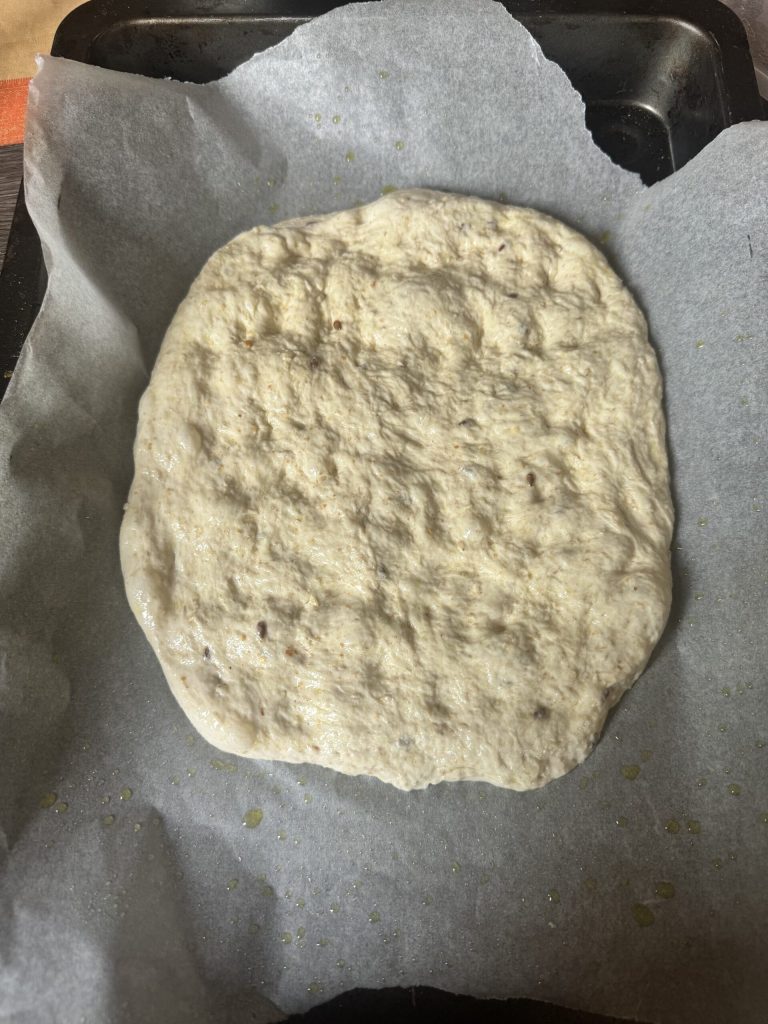 Nachdem die Kugeln fast doppelt so groß sind, sie vorsichtig mit den Händen in einem mit Backpapier ausgelegten (und geölten, wenn gewünscht) Blech ausrollen. Bis zu dem Punkt, an dem der Teig Widerstand leistet, ausrollen, mit Frischhaltefolie und einem Tuch abdecken und warten, bis er sich entspannt.