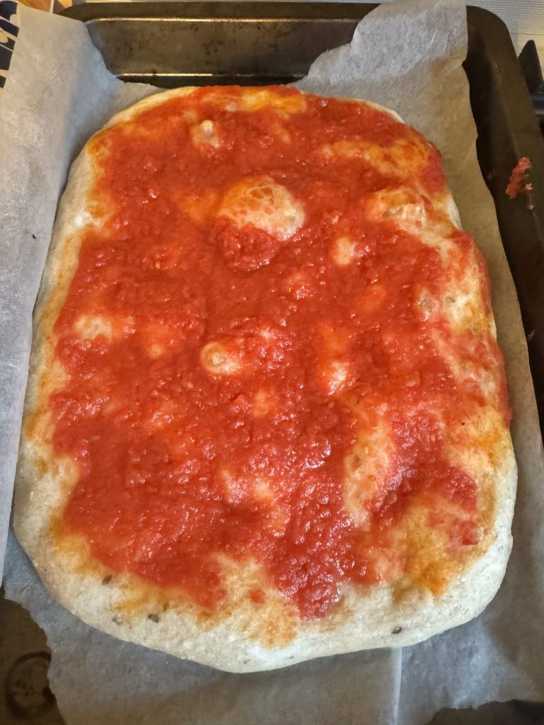 Vor dem Backen sicherstellen, dass der Ofen gut erhitzt ist, da es mit dem Pizzastein etwas länger dauern kann.Ich mache in der Regel immer einen Doppelschritt beim Backen: Nachdem ich den Tomatenpüree aufgetragen habe, stelle ich das Blech so nah wie möglich am Boden für etwa zehn Minuten in den Ofen, um den Boden zu garen und das Aufgehen zu ermöglichen.