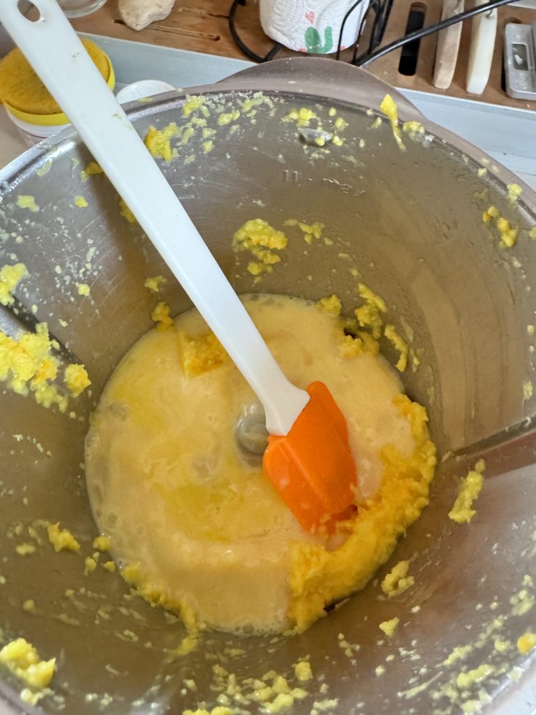 • Bei laufendem Bimby bei Geschwindigkeit 4 das Mehl nach und nach durch die Öffnung hinzufügen, damit es sich optimal mit der Mischung verbindet. Ich habe dafür etwa 1 Minute und 45 Sekunden gebraucht.