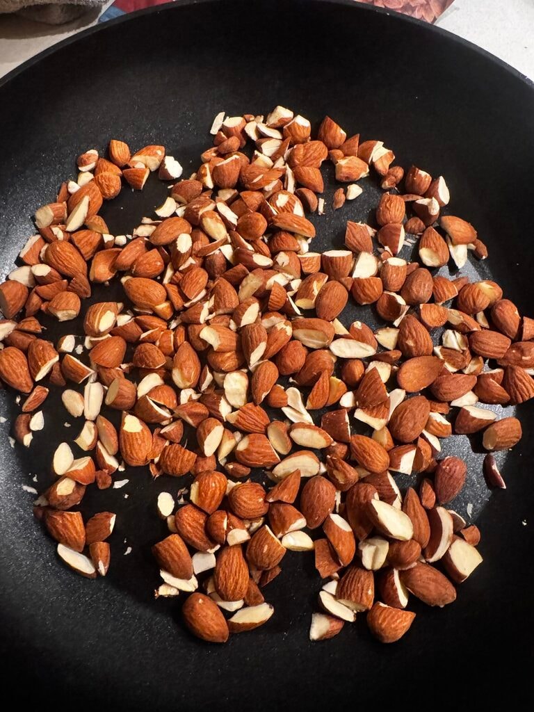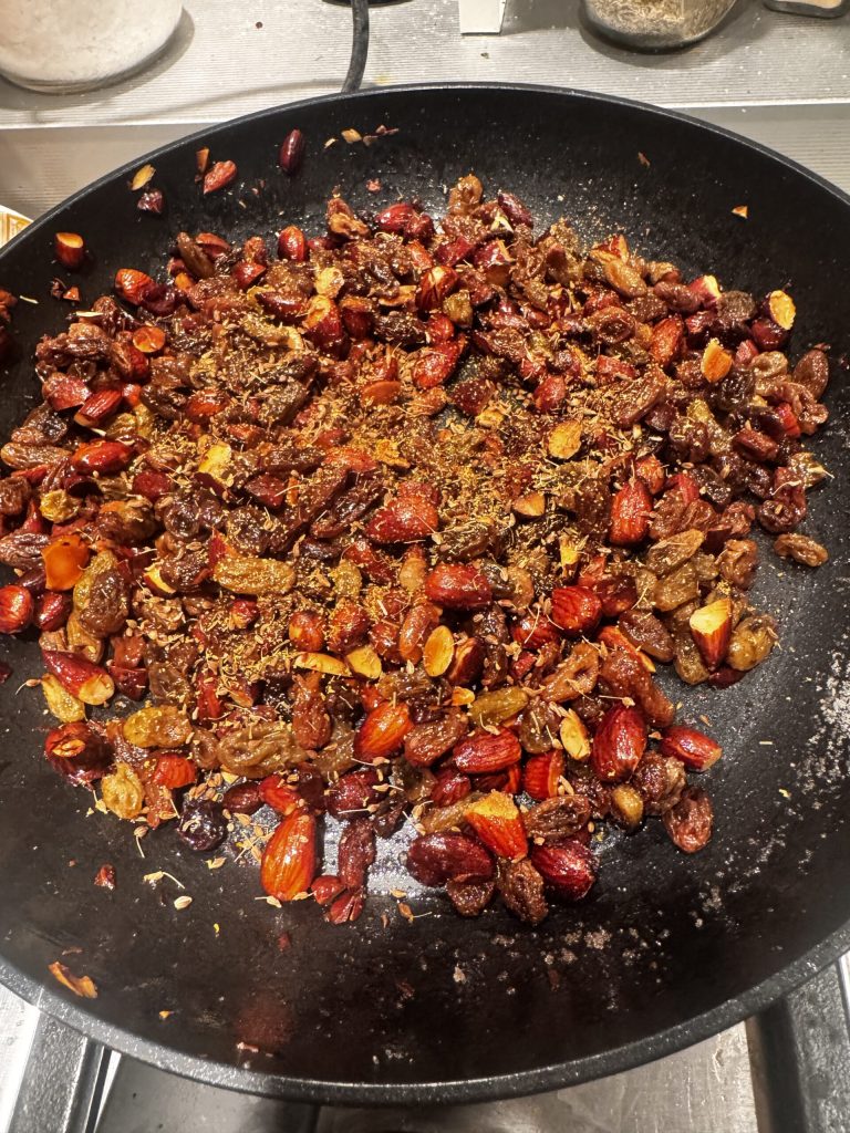 Die Rosinen abtropfen lassen und ausdrücken und zu den gerösteten Mandeln hinzufügen. Bei schwacher Hitze mischen.