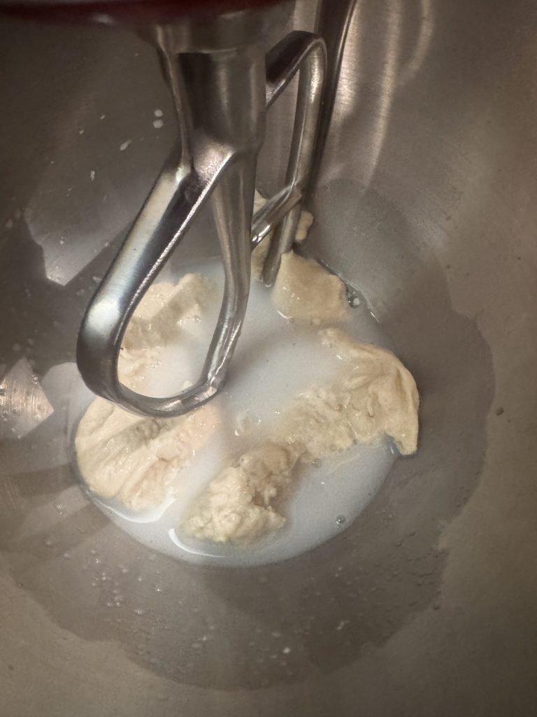 In der Küchenmaschine mit dem Flachrührer den Sauerteig zerkleinern. Milch und Wasser in einer Schüssel mischen und 100 Gramm davon verwenden, um den Sauerteig bei mittlerer Geschwindigkeit aufzulösen.