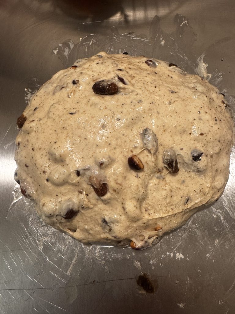 Die Zubereitung, das Formen und Backen des Pan co‘ Santi mit Sauerteig ist im Grunde wie das Backen eines etwas reichhaltigeren Brotes, dem Gewürze, Rosinen und Nüsse hinzugefügt werden. Ein wenig aufwendig, aber nicht schwierig für diejenigen, die regelmäßig Brot backen. Für diejenigen, die es nicht tun, braucht es nur ein wenig Geduld und Aufmerksamkeit, aber indem man die Schritte befolgt, wird es jedem gelingen! Ich bevorzuge es, Rosinen und Nüsse bereits vor der Ruhezeit in den Teig einzuarbeiten, aber viele tun diesen Schritt erst, nachdem der Teig verdoppelt ist.