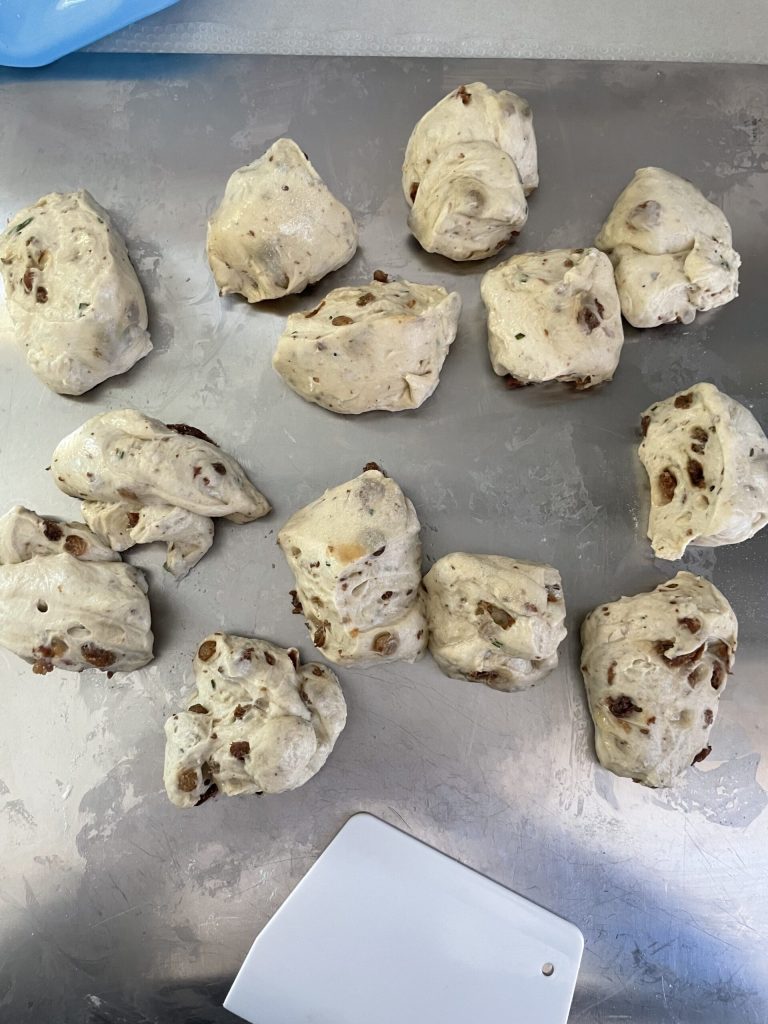 • Nach der Nacht den Teig aus dem Kühlschrank nehmen und auf Raumtemperatur bringen. Nach mindestens einer Stunde (obwohl dies stark von der Raumtemperatur abhängt) die Masse auf das Backbrett stürzen und mit Hilfe eines Teigschabers und einer Waage den Teig portionieren. Ich habe 13 Teile zu je 70/80 Gramm gemacht, aber die Rosmarinbrötchen in den Bäckereien wiegen auch über 100 Gramm.