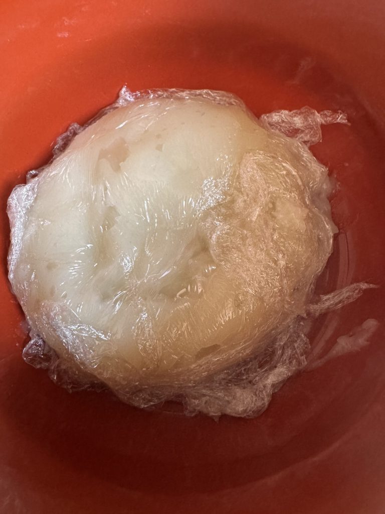 Am nächsten Tag den Teig aus dem Kühlschrank nehmen und auf Raumtemperatur bringen. Er wird ein wenig wachsen, aber es ist nicht wichtig, wenn er das nicht tut, da er noch eine weitere Gärung durchlaufen muss.
