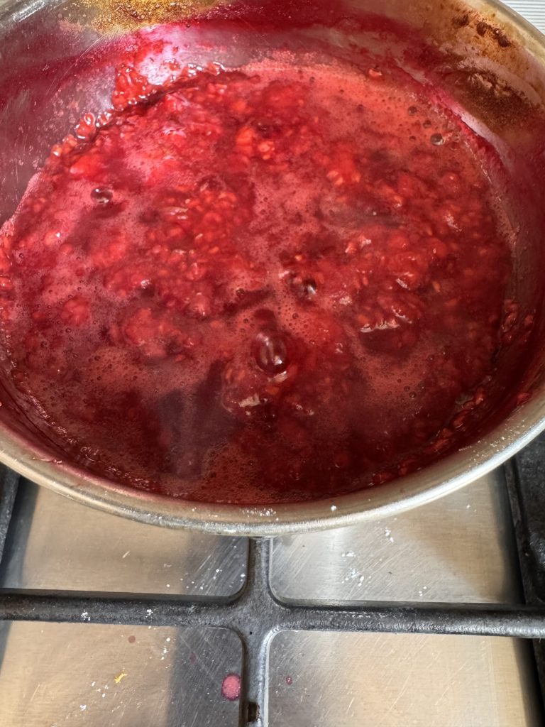 Nach und nach werden die Himbeeren schmelzen und ein Teil der Flüssigkeiten wird verdampfen. Wenn die Mischung ausreichend dick ist und keine sichtbaren Himbeeren mehr vorhanden sind, ist sie bereit für den nächsten Schritt.