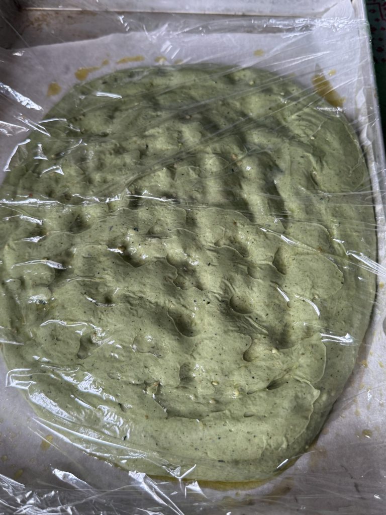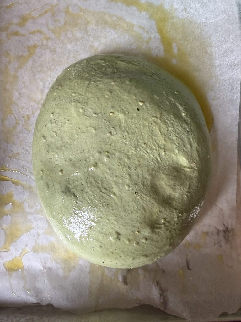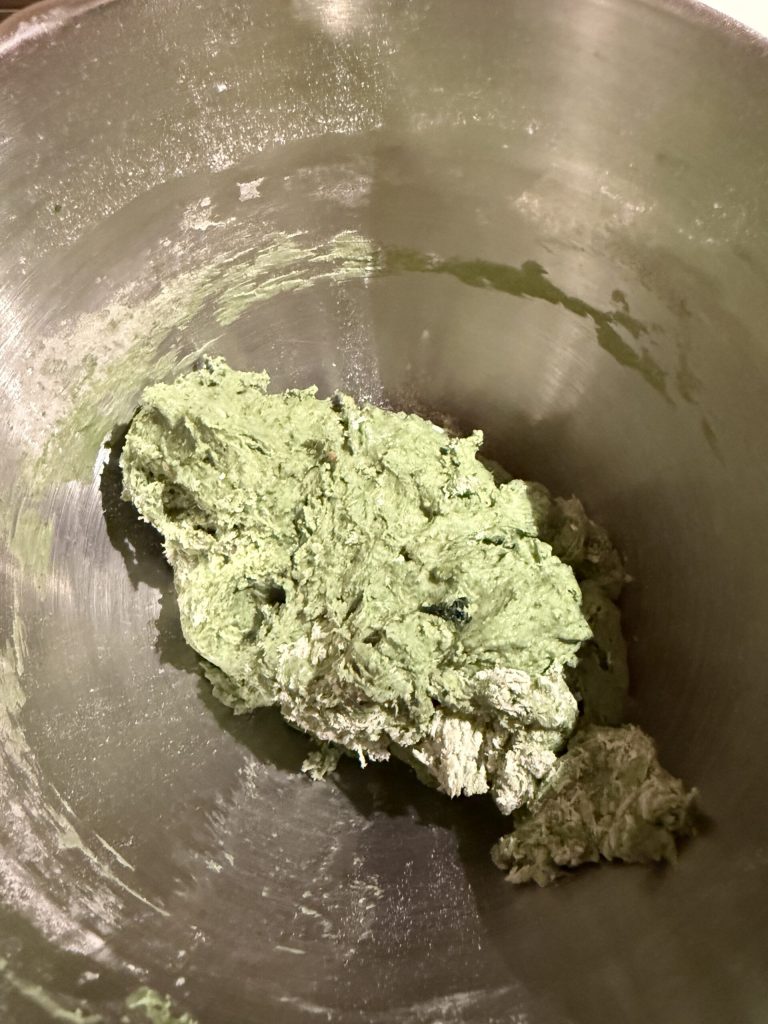 Wenn der Sauerteig gut aufgelöst ist, gib die Schwarzkohl-Paste dazu. Rühre mit dem Flachrührer auf niedriger Geschwindigkeit, bis die Masse eine halbflüssige Konsistenz hat … und ein schönes intensives Grün.