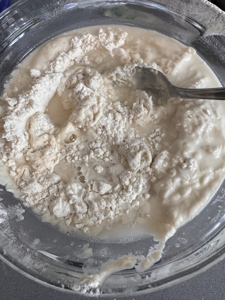 Beginnen Sie, das Autolyse-Wasser hinzuzufügen und mit einem Löffel zu mischen. Das Mehl sollte das Wasser aufnehmen.