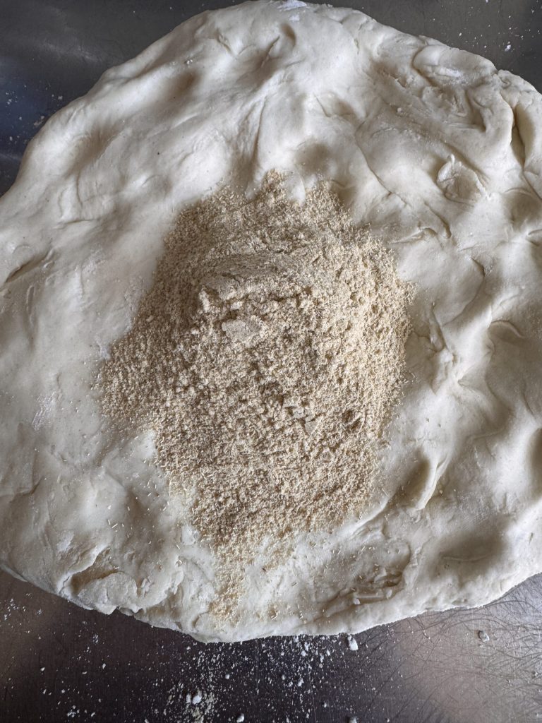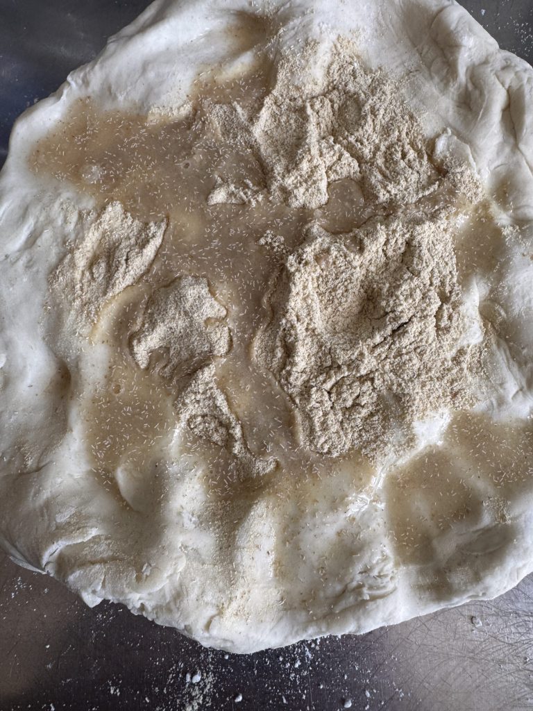 Den Teig ausbreiten und den getrockneten Sauerteig darauflegen