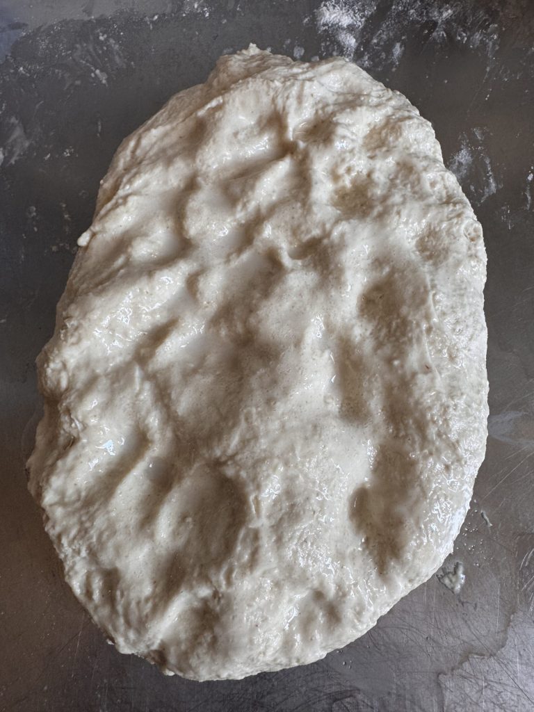 Nach der angegebenen Zeit vorsichtig eine Teigportion nehmen und auf den Arbeitstisch ausbreiten, dabei darauf achten, die Gärgase nicht zu zerstören.
