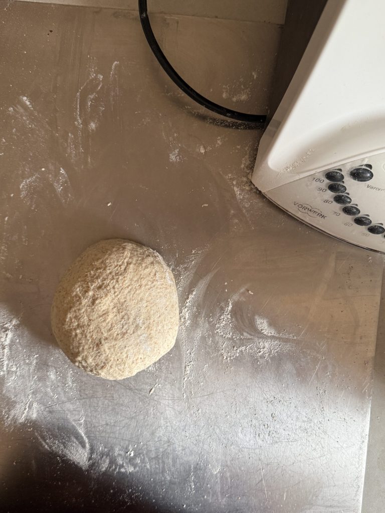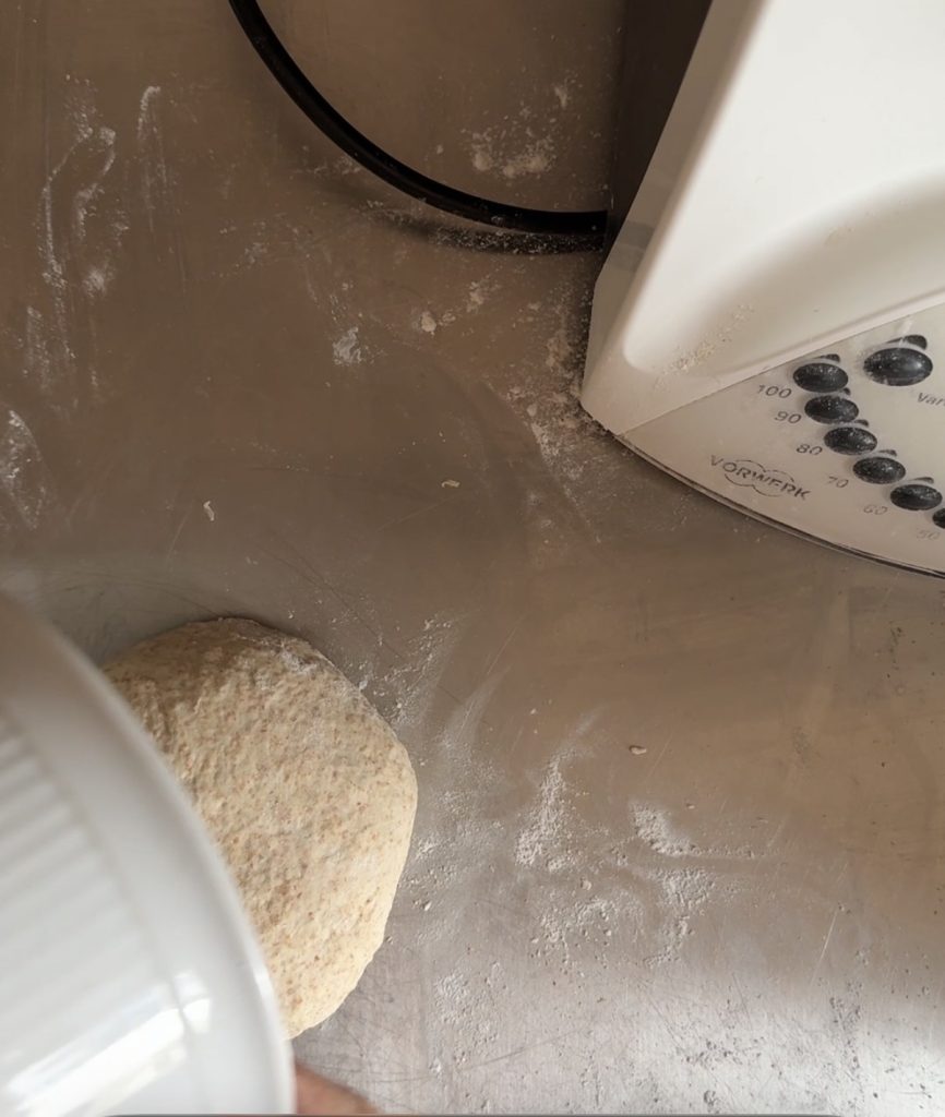 Die Hälfte des Wassers hinzufügen und den Bimby im Knetmodus starten.