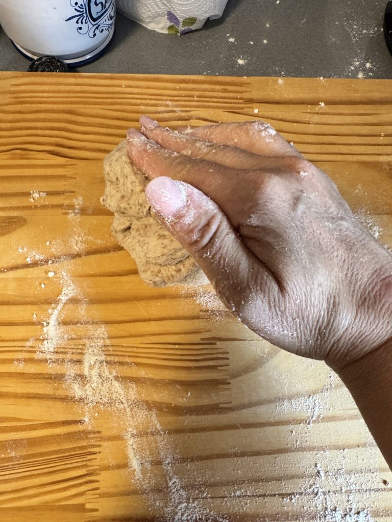 Nach der Ruhezeit unter der Schüssel ist der Teig der Vollkorn-Malfatti ohne Eier weich und elastisch und bereit, ausgerollt zu werden.