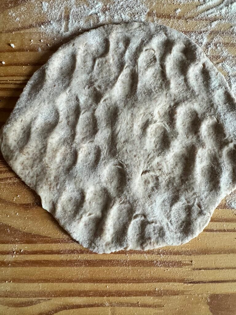 • Nachdem man die Arbeitsplatte großzügig mit Hartweizengrieß bestäubt hat, beginnt man, den Teig mit den Fingern auszustrecken.