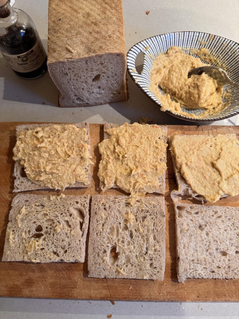 Nachdem Sie das Sandwichbrot mit Sauerteig zubereitet haben, gibt es viele Möglichkeiten, es zu verwenden. Natürlich kann man leckere Sandwiches oder belegte Brote machen, aber ich schlage eine alternative Verwendung vor: die Herstellung von Garnelen-Toasts wie im chinesischen Restaurant! Sie sind sehr einfach zuzubereiten und hier sind die Schritte, um sie zu machen. Diese Toasts können auch mit glutenfreiem Sandwichbrot gemacht werden, wie meine Freundin Selene es gemacht hat. Hier ist ihr Rezept mit dem LinkIn einem Mixer 150 g geschälte Garnelen, 2 Esslöffel Maisstärke, eine Frühlingszwiebel und die Schale einer halben Zitrone pürieren, bis eine sehr dichte Creme entsteht.