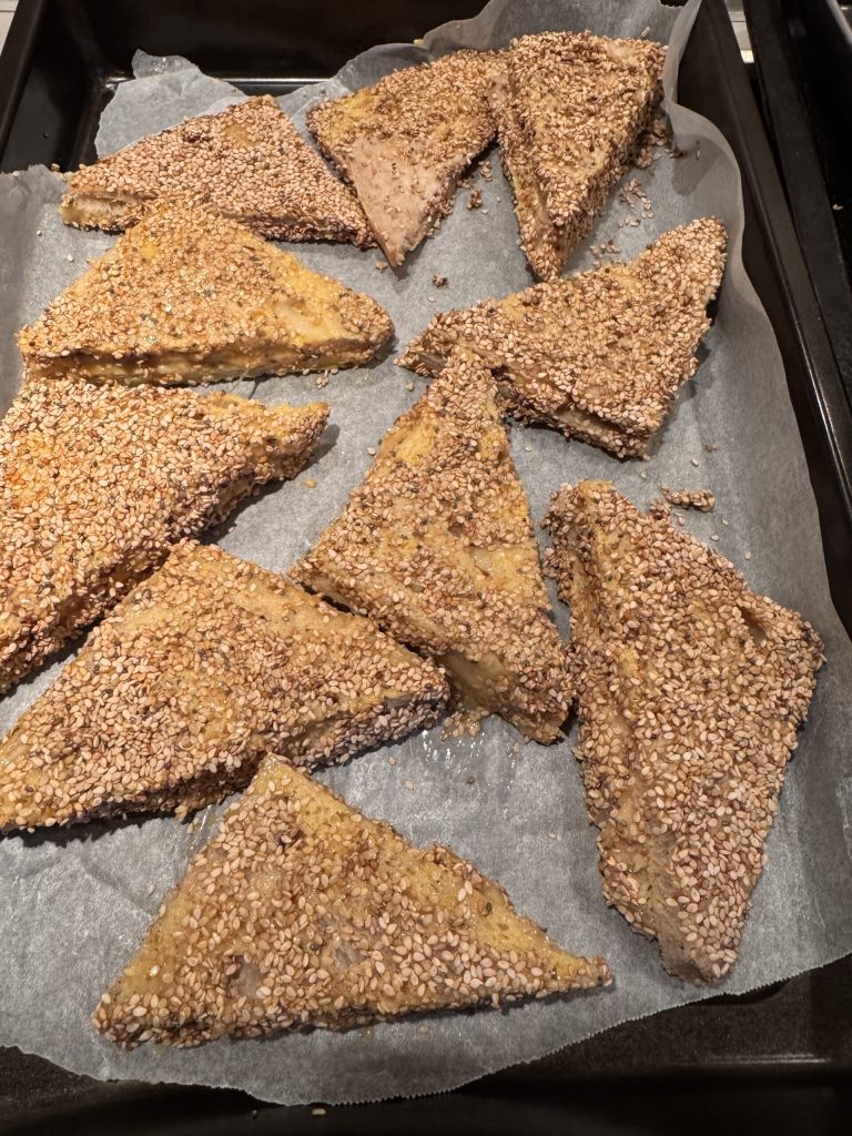 Die Sandwichbrotscheiben abschneiden und die Garnelencreme auf die Hälfte der Scheiben streichen (ich habe 4 ganze „Toasts“ gemacht). Schließen und diagonal schneiden. Ein Ei verquirlen und den Toast darin eintauchen. Anschließend in einer Schüssel mit Sesamkörnern wenden