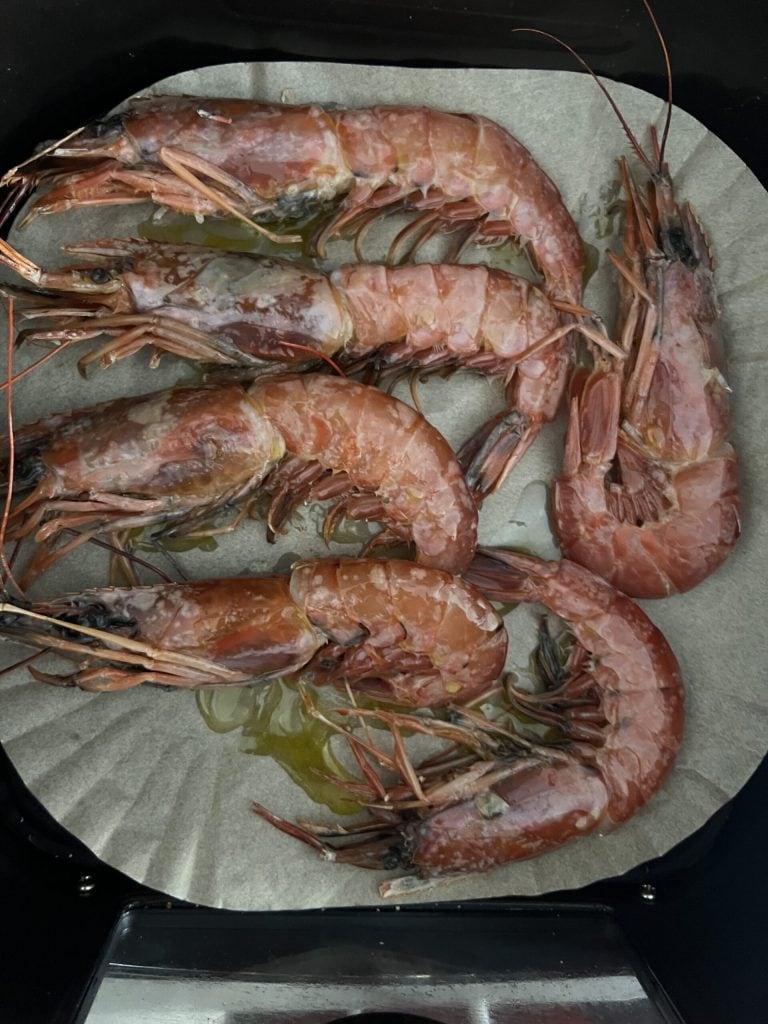 • Wir reinigen die Garnelen, indem wir unter dem Panzer und oben einen Schnitt machen, um den Darm zu entfernen. Wir spülen sie gut ab und legen sie auf das Backpapier der Heißluftfritteuse.